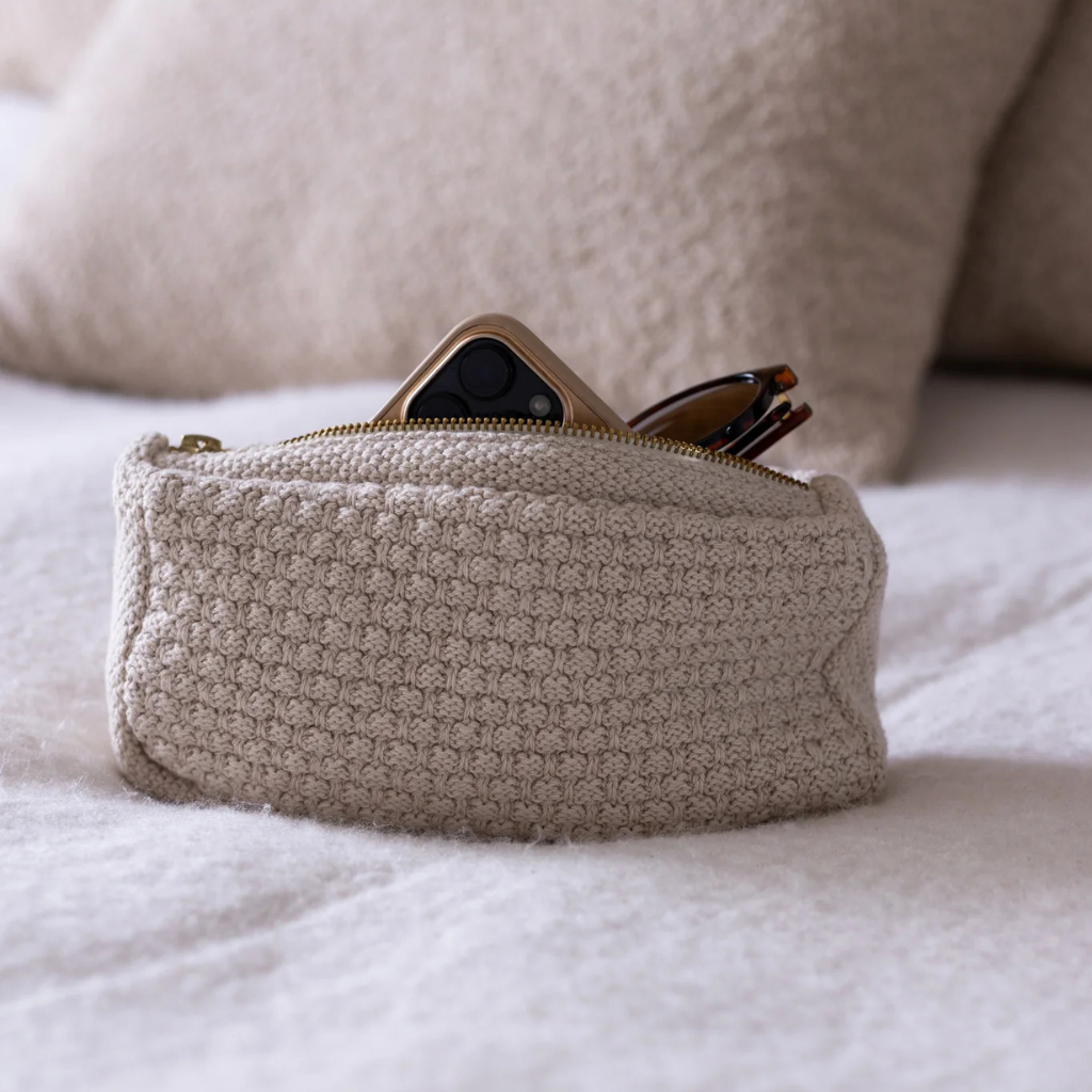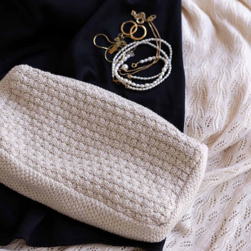 Fin strikket clutch i økologisk bomuld. Kan også bruges som toilettaske, penalhus eller kosmetikpung. Clutchen har et inderfoer af bomuld og gemmer på en lille lomme indeni. Lukkes med nikkelfri lynlås.