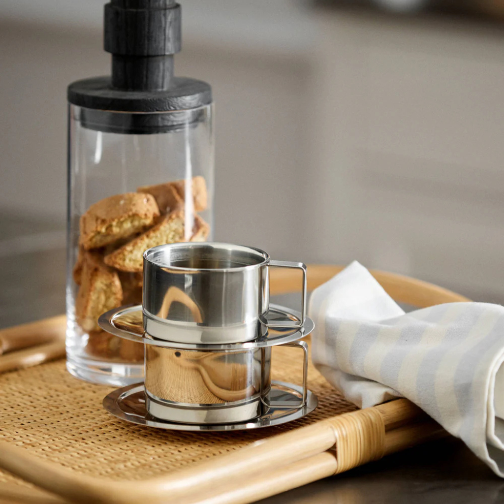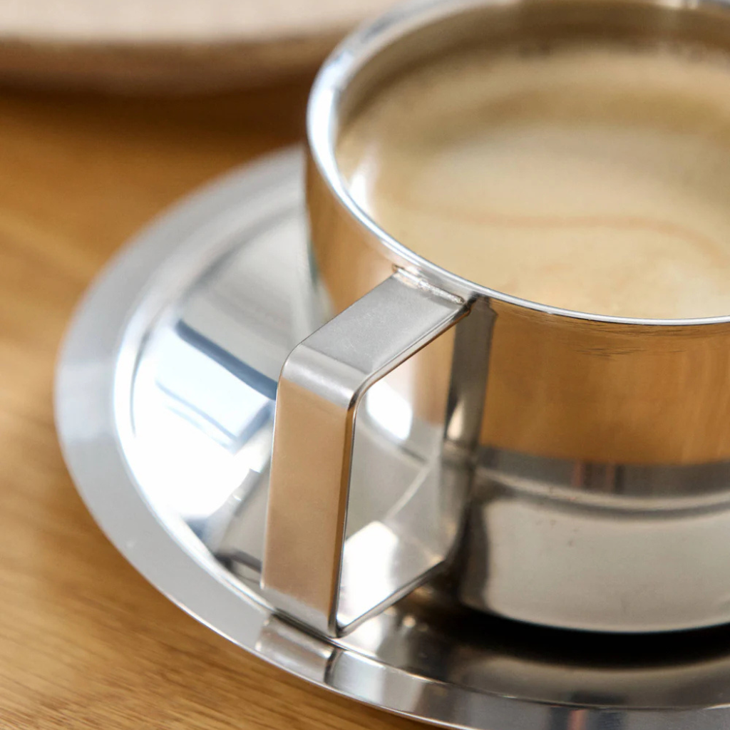 CITREA koppen med underkop bringer et moderne og sofistikeret udtryk til borddækningen. Den blanke kromfinish reflekterer lyset smukt, mens det enkle og tidløse design gør sættet velegnet til både kaffe, te og små serveringer.