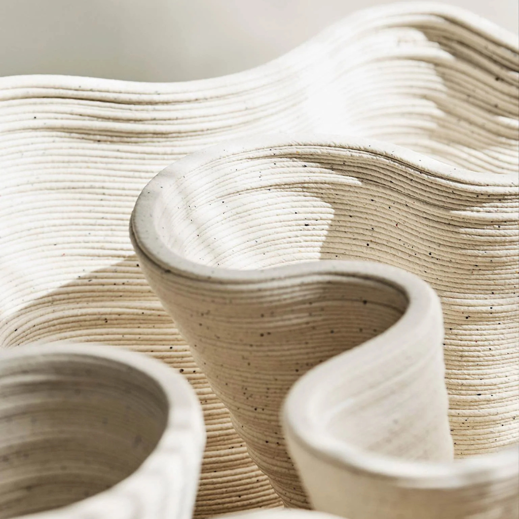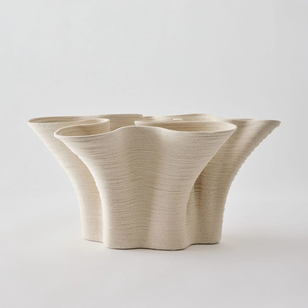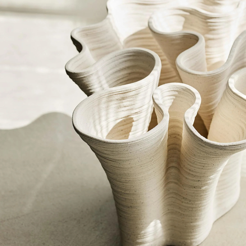 Fiordo large har samme rolige, naturinspirerede design som small-versionen, men med større dimensioner. Den brede, flade profil og de bløde kurver skaber et markant, men elegant udtryk, perfekt til større blomsterarrangementer. 3D-printen giver præcise detaljer, mens indersiden er behandlet, så den kan tåle vand – dog bør vasen ikke stå på følsomme overflader.
