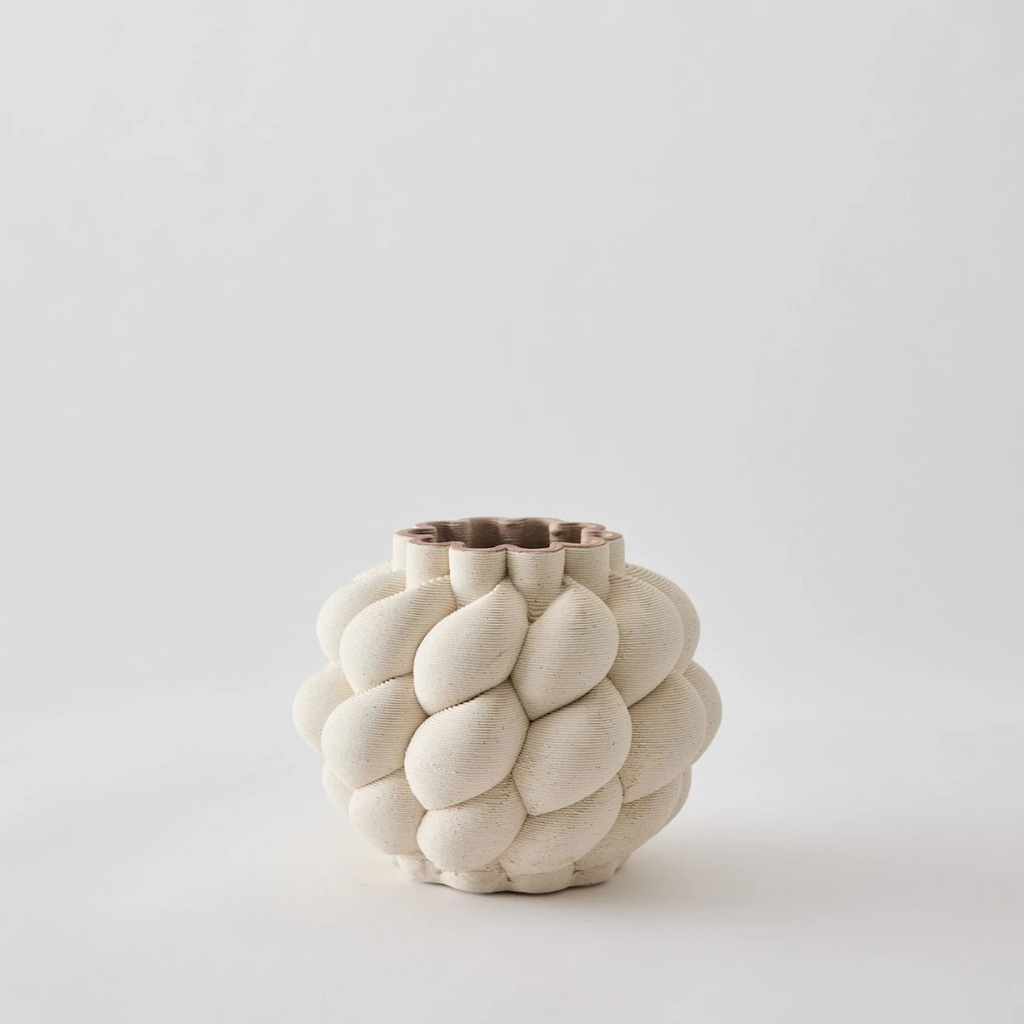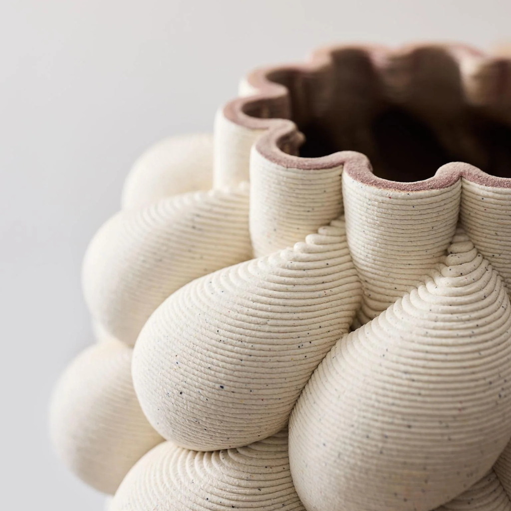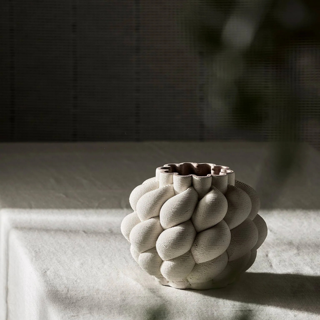Nuvola er en naturinspireret 3D-printet vase i porcelænsler med et kurvet og levende formsprog. Den runde profil og de bløde linjer giver vasen et organisk og elegant udtryk, mens 3D-printingen sikrer præcise linjer og en detaljering, som er svær at opnå i hånden. Indersiden er behandlet, så den kan tåle vand, men på grund af lerets naturlige porøsitet bør vasen ikke placeres på følsomme overflader.
